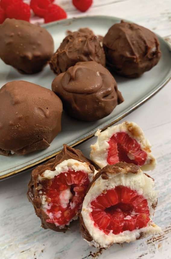 - Faça bolinhas, coloque uma framboesa no interior e leve ao congelador entre 30 a 60 mins.