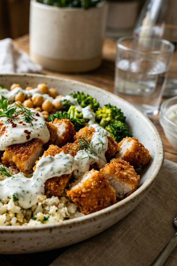 Bowl de arroz de couve-flor com frango crocante e molho de iogurte
