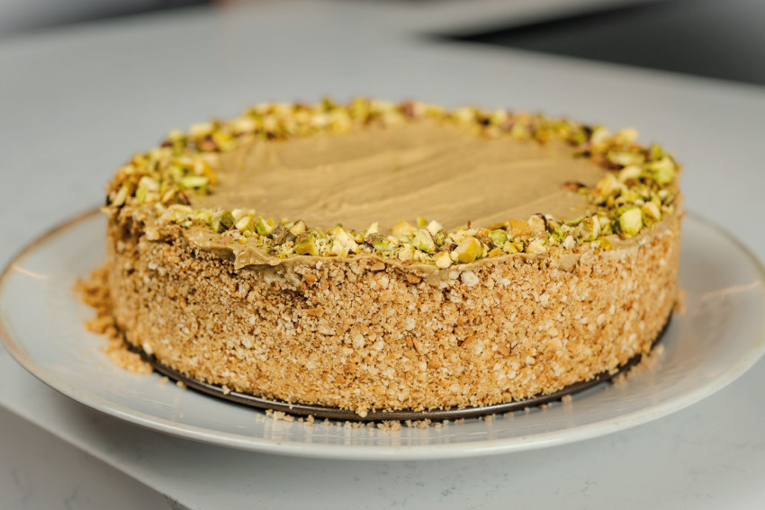 Assim sendo, o recheio é onde a magia acontece. Uma mistura de vários ingredientes que se transforma num creme celestial. A adição dos pistachios triturados confere uma textura surpreendente a cada garfada.