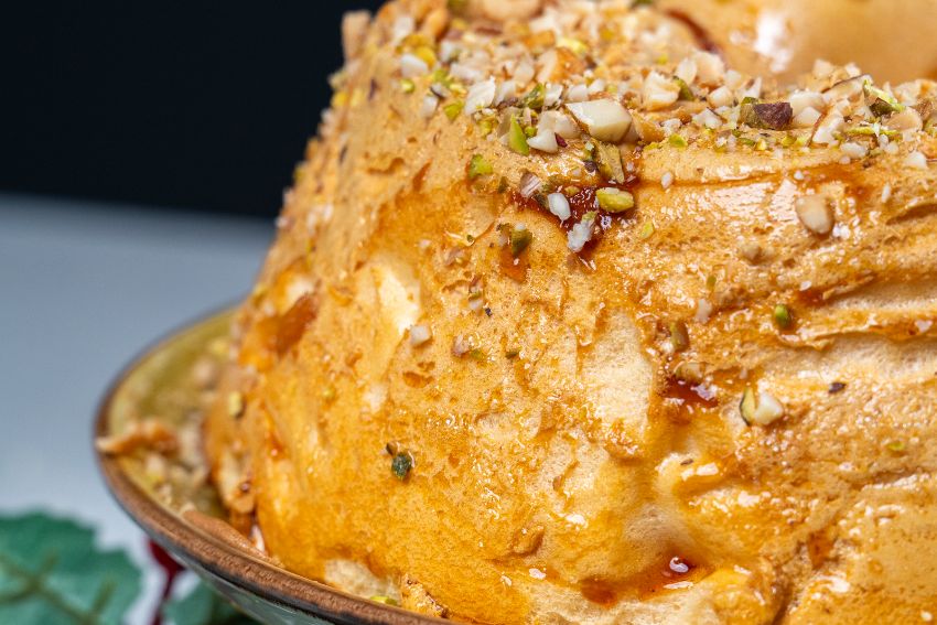 - Desenforme o molotof e regue com o doce de ovos. Polvilhe com amêndoa laminada! Desfrute!