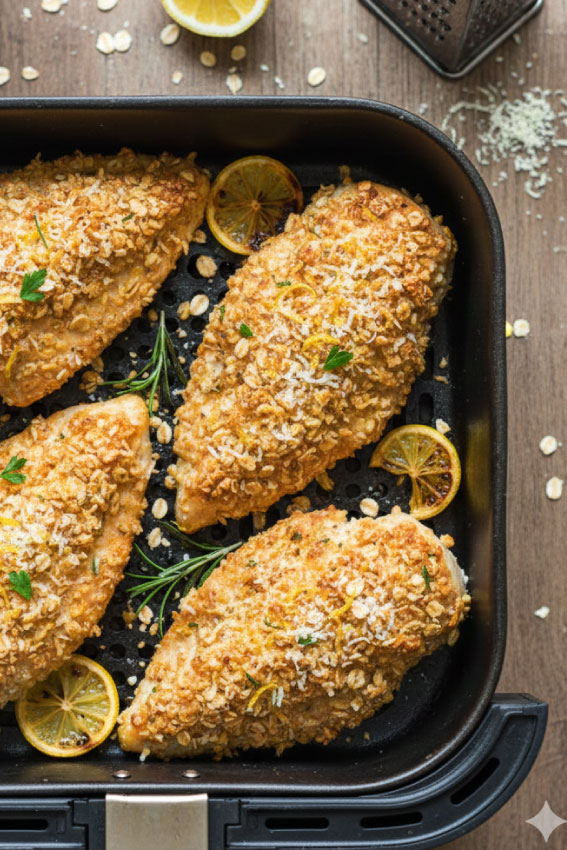 Peitos de frango na air fryer com crosta de aveia, limão e parmesão